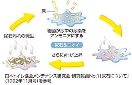 尿や水滴が床・壁に飛散し、それが細菌の栄養素となると、アンモニア臭が発生します。具体的には、細菌が尿中の尿素をアンモニアに分解することで、ニオイが発生する仕組みです。目地部分や微細な凹凸に尿が入り込むと、掃除しても取り除きにくくなるため、時間とともに臭気が強まります。