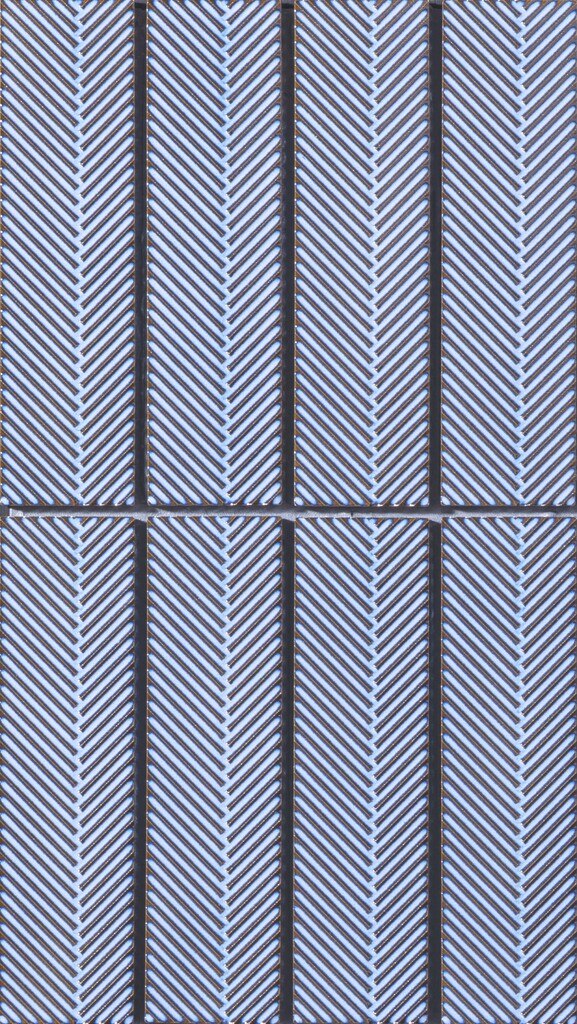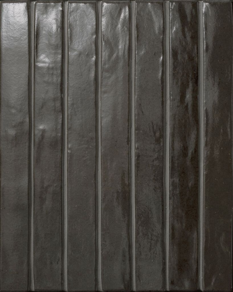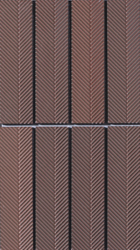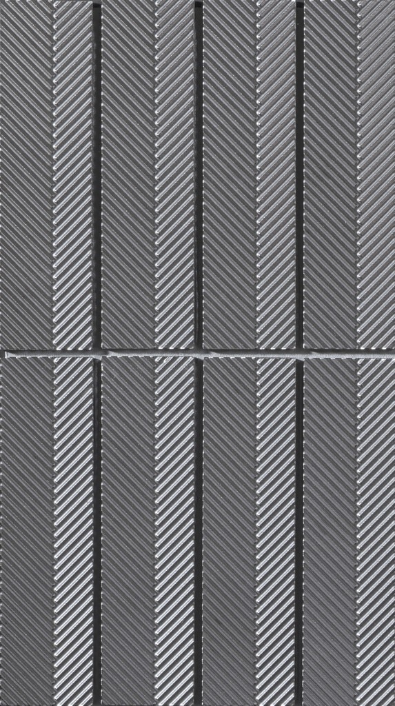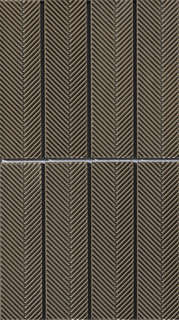 伝統文様と金属質の光沢が、風格ある空間を創り出すタイル。矢羽根のリブに釉薬の流れ が陰影を刻み、重厚な艶と豊かな表情を纏います。落ち着いた色調が周囲に溶け込み、品 格を引き立てます。ホテルロビーやエントランス、和の店舗のほか、外壁にも使用可能で、 ファサードに上質な存在感を添えます。