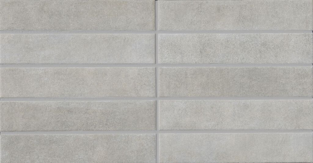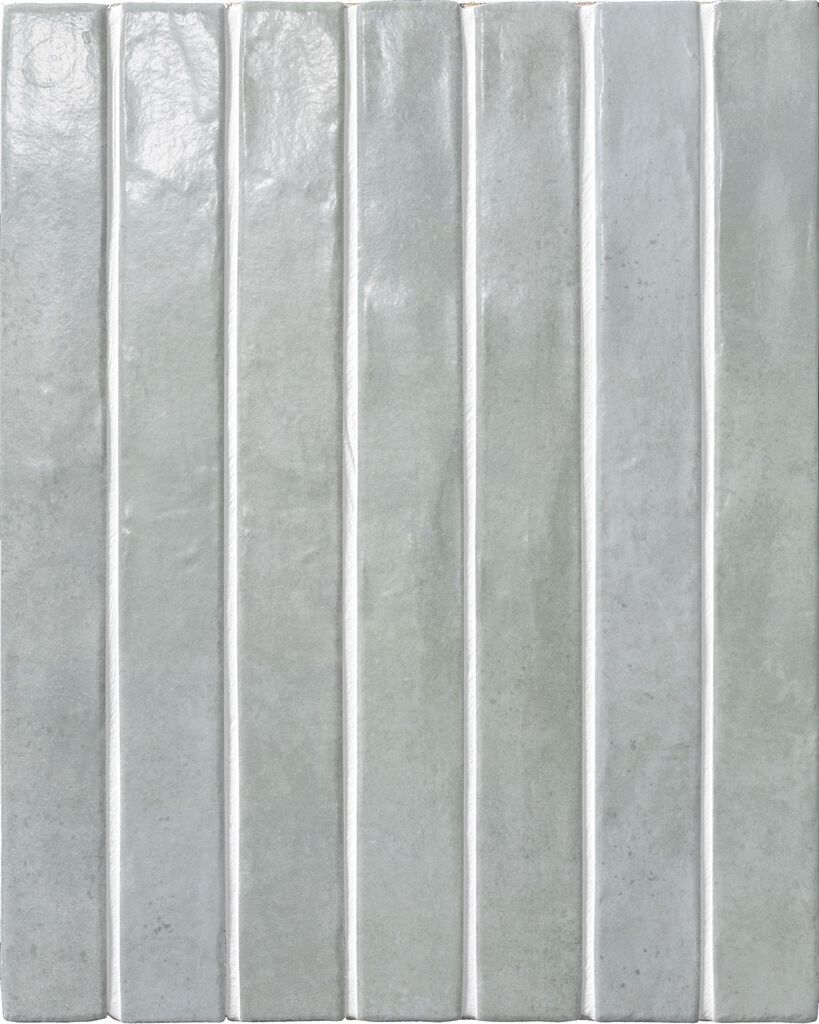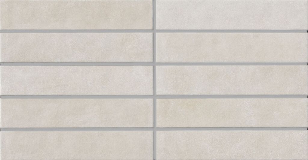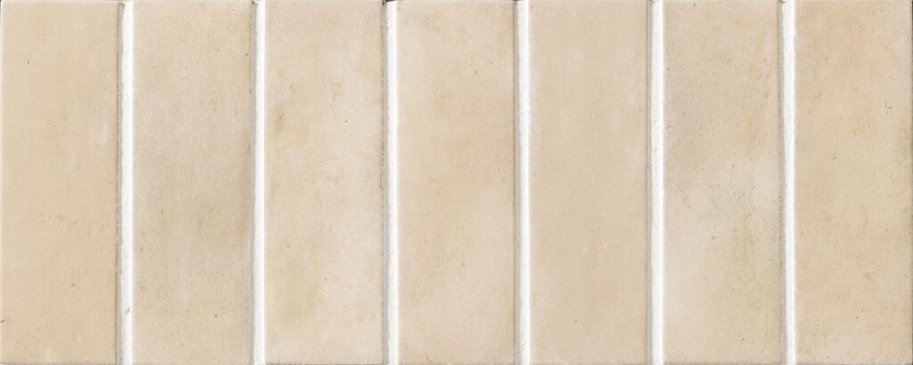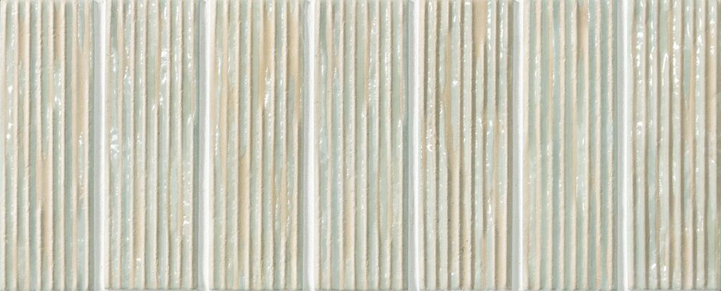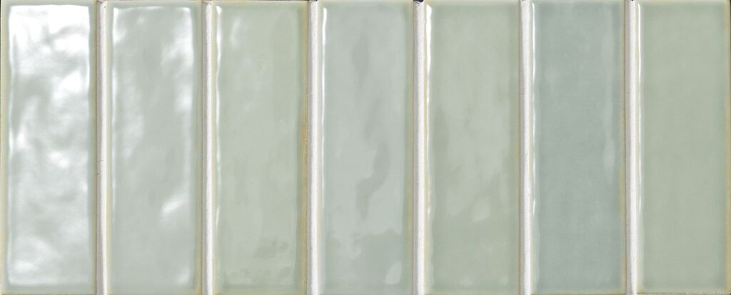 シャープなエッジ形状にこだわった細長いボーダーが、美しい面を形成します。また、小さな結晶を含んだ釉薬から、焼き物らしい温かみを感じます。少しスモーキーなパステルカラーは木目などのナチュラルな素材と合わせやすく、すっきりとした居心地の良さを演出できるタイルです。